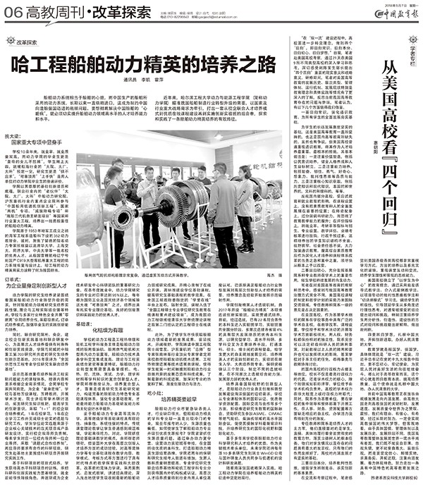 近年来,学校瞄准国家“海洋强国”战略和中国船舶工业转型升级,以国家及行业重大战略需求为牵引,打出一套从校企联合人才培养模式到优质在线课程建设再到实施创新实验班的组合拳,探索和实践了一条船舶动力精英培养的有效路径。2018年5月7日《中国教育报》专版,以《哈工程船舶动力精英的培养之路》为题,报道了我校动力学院船舶动力精英人才培养的有效路径,创新型人才培养在国内起到了一定示范作用,并得到了国家级媒体的关注。
