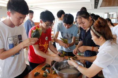 本次活动中,食堂工作人员首先指导大家粽子的包法,介绍了粽叶糯米的用法,并做出示范。同学们学习之后也进行了尝试,食堂工作人员在一旁对不熟悉做法的同学们加以指导,对大家在包粽子过程中存在的问题进行了进一步说明,大家与工作人员们热情交谈,传递出节日的欢快气氛。活动结束后,同学们拿着亲手包的粽子进行合影留念,工作人员为前来参加活动的同学们分发五彩绳。