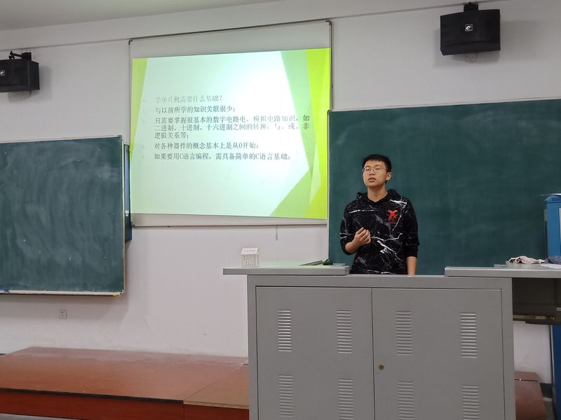 活动开始,主讲人从结构、造型、装置等方面对单片机进行介绍。随后扩展介绍在科技创新过程中单片机的作用,对其内部各个结构的制作方法和用途进行解释。活动尾声,刘晓阳与同学们互动交流,对同学们的困惑一一解答,并表示同学们以后遇到这方面问题时他可以提供帮助。