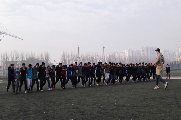 初春的早晨室外气温较低,运动员在进行短暂热身活动后迅速投入训练当中。由于同学们是刚被挑选出来第一次进行正式统一配合训练,还处于磨合阶段,不能协调平衡,步伐步距不一致,导致有同学摔倒在地,但所有同学秉承着不抛弃不放弃的态度坚持训练。训练历时近一小时,随着练习次数的增多,同学们的动作开始整齐划一起来,尽管仍存在些许不足之处,但改进效果较为显著。
