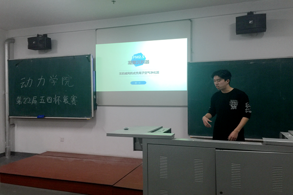 复赛采取答辩的方式进行,参赛选手通过ppt和实物相结合的方式向裁判与观众展示参赛作品和理念。本次比赛共23件作品参赛,包含从负离子空气净化器到双档位控温控向风扇各个方向的创新作品。参赛作品反映动力学院学生将环保,科技,创新进行结合的特点。