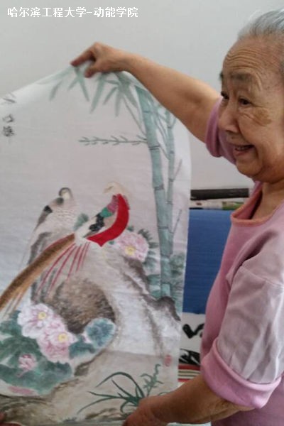 期间,由孙奕晗带领大家为老人切水果,然后陪老人聊天,与老人们畅谈往事及我们大学的生活。接下来由张士熊同学领先倾情献唱《新贵妃醉酒》,大家跃跃欲试,纷纷献唱。在同学们展示完自己的才艺后,老人向大家展示了自己收藏及绘制的字画,书法笔力刚健,山水花鸟画精细别致。最后大家合影留念。