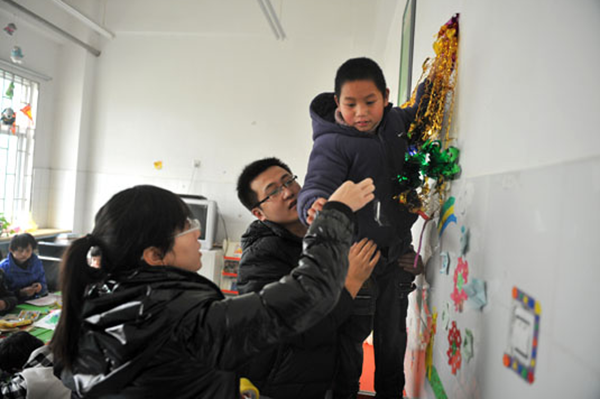 在历经大约两个小时之后,一行人终于来到了服务中心。在金色阳光智障残疾人托养服务中心,大家看到了形形色色需要关心需要温暖的儿童。在这间略显简陋的服务中心,不同年龄段的被托养儿童生活在一起。服务中心的负责人告诉一行人,这些儿童里面不少是有先天残疾的儿童,要做到好好照顾他们必须投入大量的人力物力财力,即使政府和社会给予了很多帮助,但实际运行过程中却会遇到很多困难。但是,大家却看到被看做弱势群体的这群儿童,每个人的脸上都洋溢着灿烂的笑容。