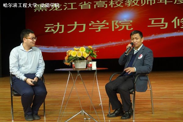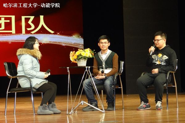 在一段音乐中同学们陆续进场,在工作人员的指引下就位。首先,主持人请动力学院院长马修真教授上台进行访谈,学生代表为院长佩戴胸章并握手合影。马院长讲述他自己求学时的经历与生活情况,并表示如今的学习条件是多么优秀,希望同学们珍惜现在,努力学习。此外,马院长还根据主持人提供的照片,讲述哈军工时期的故事,描述哈军工时期的辉煌。马院长指出,当年哈军工是一个能与清华北大并肩的学校,并向往着如今的哈工程可以以军工为目标不断发展。最后,针对哈工程 “最憋屈大学”的称呼,马院长详细列举学校为国防建设和海洋强国做出的杰出贡献,以及国家政策对学校的支持,鼓励学生们树立坚定的信心。