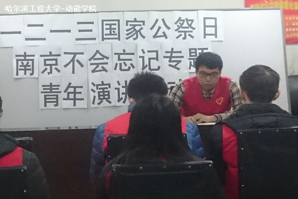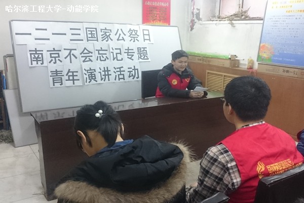 12月13日为南京大屠杀死难者国家公祭日,动力学院青协前往黎华社区进行演讲旨在怀缅在南京大屠杀中的遇难者,同时向社区居民及志愿者们宣传正确的爱国思想和行为。活动期间,听讲人员对南京大屠杀进行初步了解后表达对南京大屠杀案的看法。活动氛围良好,听讲人员积极发言。随即主讲人向大家介绍正确的爱国方式,并提醒他们应该勿忘国耻,理性爱国。