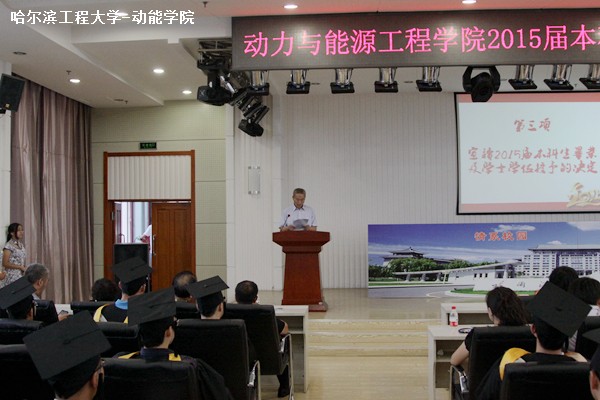 6月25日晚,动力学院于动力楼15楼举办了2015届毕业生毕业典礼暨学位授予大会。参加大会的有哈尔滨工程大学副校长赵琳、动力学院副院长李淑英、党委书记彭宗德、党委副书记张为峰、15级毕业生辅导员李唯一。动力学院的部分老师以及部分毕业生家长也参加了本次大会。活动由部分毕业生组织策划,动力学院传媒社、学生会协助开展。