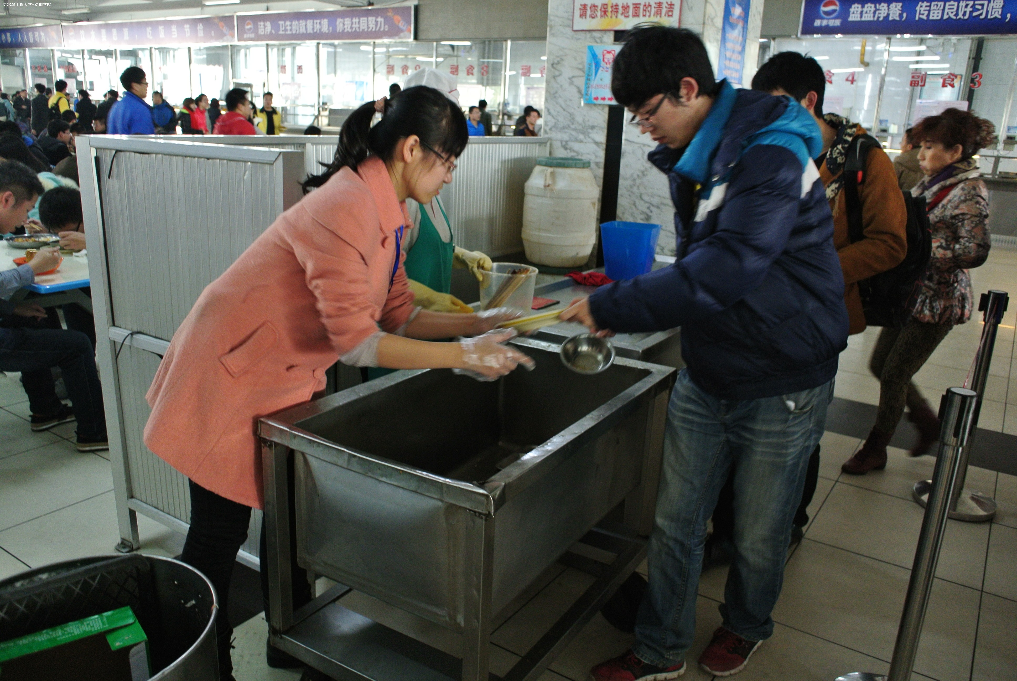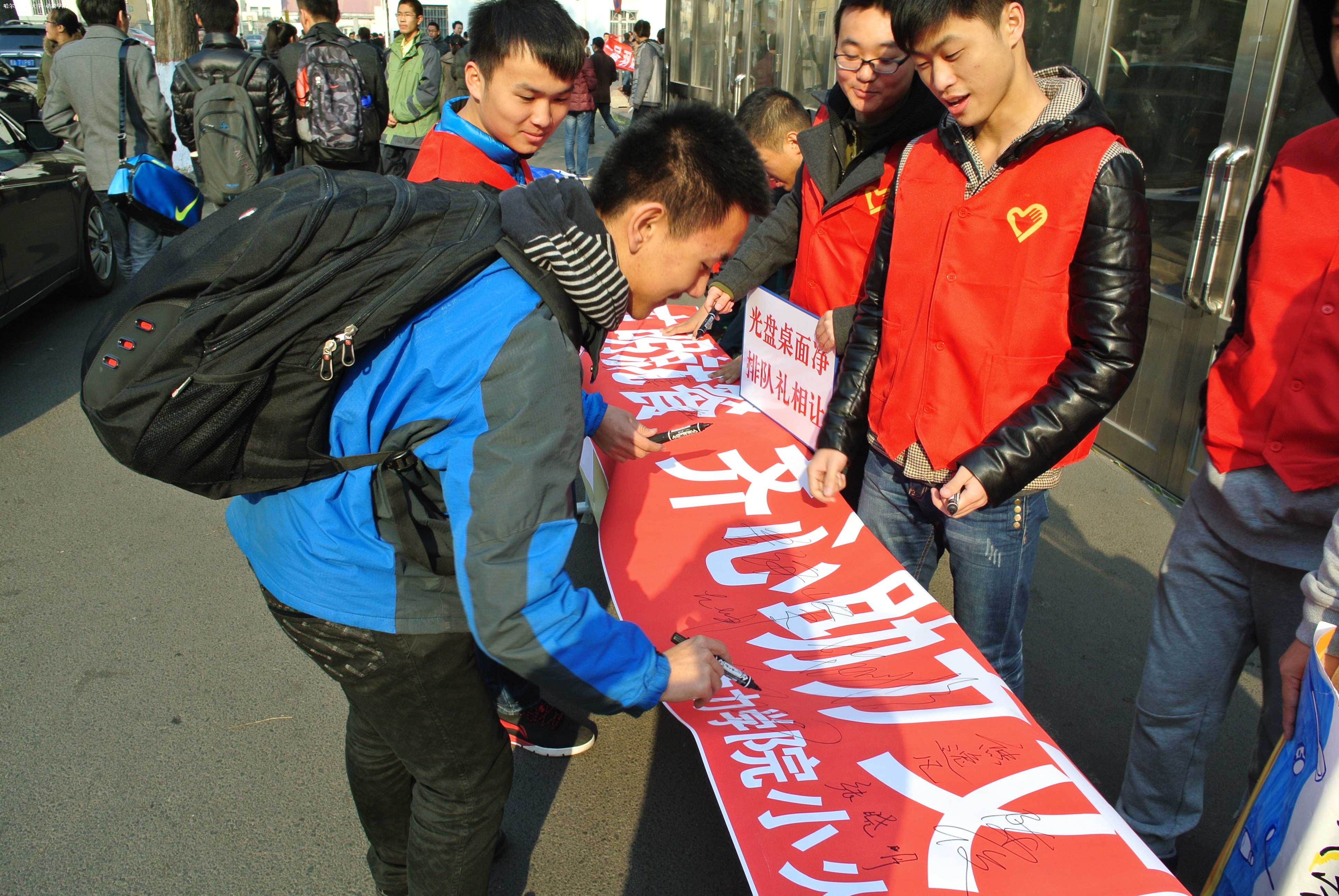 在整个活动中,学院安排人员在大美食堂各楼层进行检查,对排队秩序混乱这类不文明现象予以提示和纠正。同时,同学们还积极协助食堂工作人员清理餐桌上的残留物、整理使用后的餐具等。对食堂就餐环境起到了很好的改善作用。另外,学院还安排一部分人员在大美食堂门口进行文明就餐的宣传活动,通过张贴宣传海报、在印有“文明就餐公约”的宣传条幅上签名的形式,吸引了前往就餐的同学们的积极参与,起到了很好的宣传推广效果。