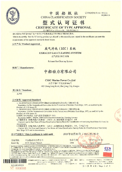 船舶废气洗涤系统目的为减少船舶动力装置排气中的硫氧化物。在燃油硫含量3.5%的极限条件下,废气SO2去除效率高于97.5%,满足IMO MARPOL对排放控制区内燃油硫含量的要求。此设备由哈尔滨工程大学自主研发,并通过了中国船级社的型式认可,是亚洲第一个获得船级社型式认可的废气洗涤脱硫装置。