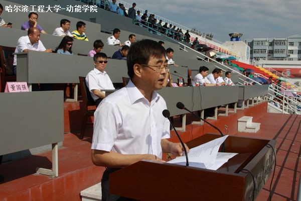 全体坐下后,主持人介绍了出席开学典礼的领导与嘉宾。接着,军训负责人、学生代表、家长代表、教师代表分别上台发言,表达自己对学校的热爱和期望。最后,校长刘志刚致辞,介绍了哈工程的光荣传统和历史使命,并对新生们寄予殷切的希望和对哈工程诚挚的祝福。